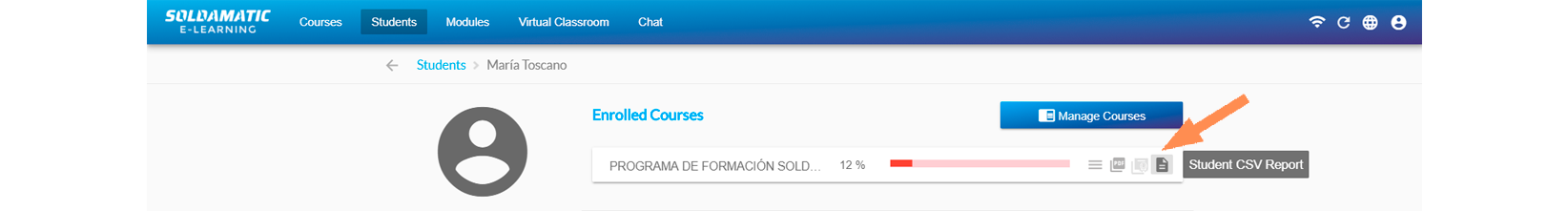 Select a course that has students enrolled and have made some progress on the course. It is shown in detail of the course. A button called «CSV Report» is displayed in the left panel button panel.
