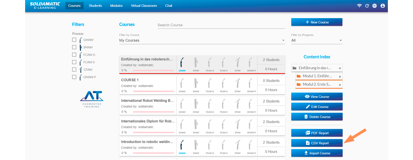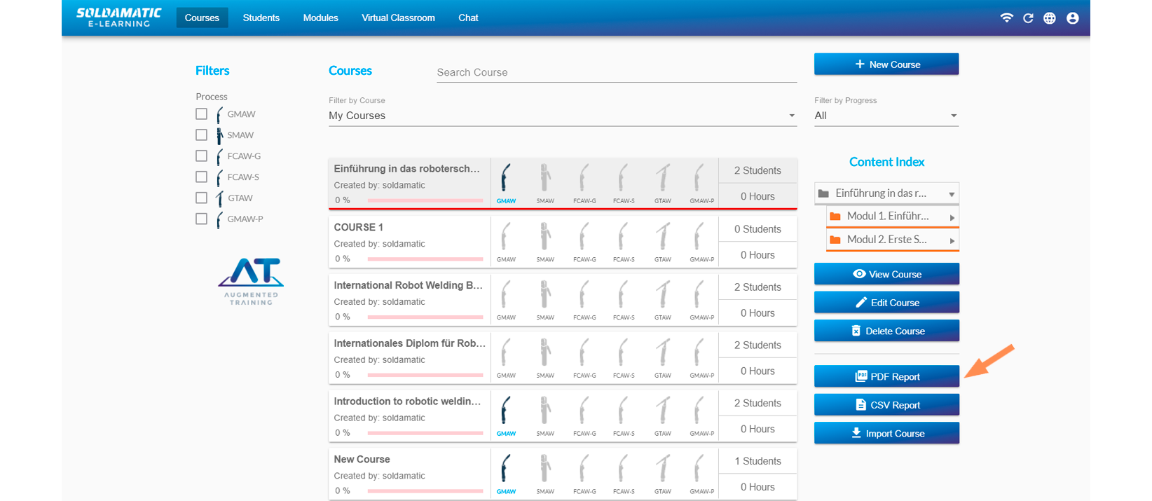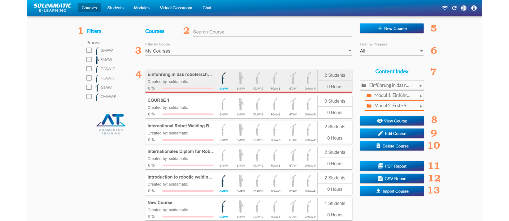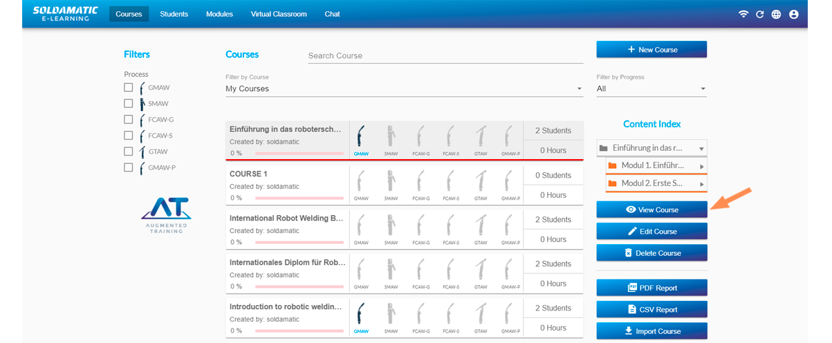 Navigate to the «Augmented Training. Soldamatic Welding Curricula» and click on it. You will see the course tree.