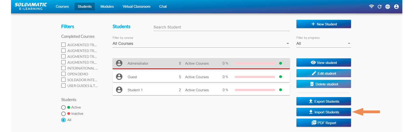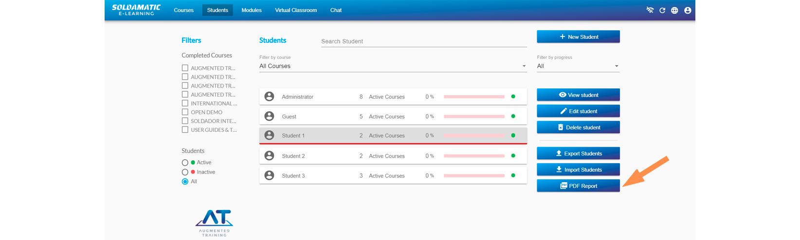 You will be able to obtain a student list report from the «Student» section, by clicking on the «PDF Report» button.