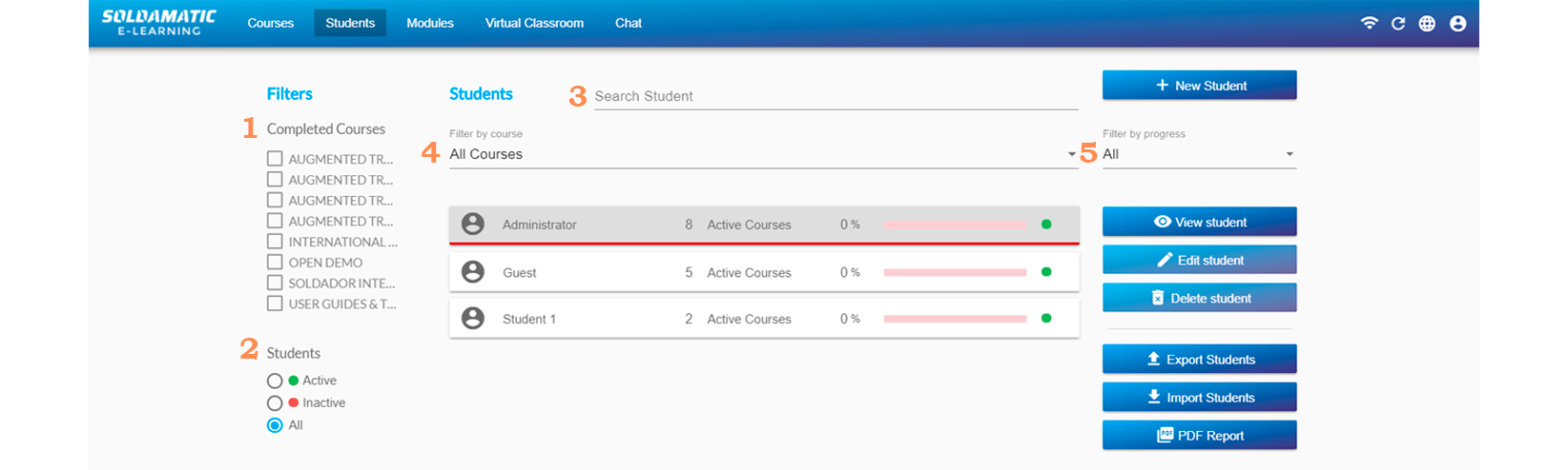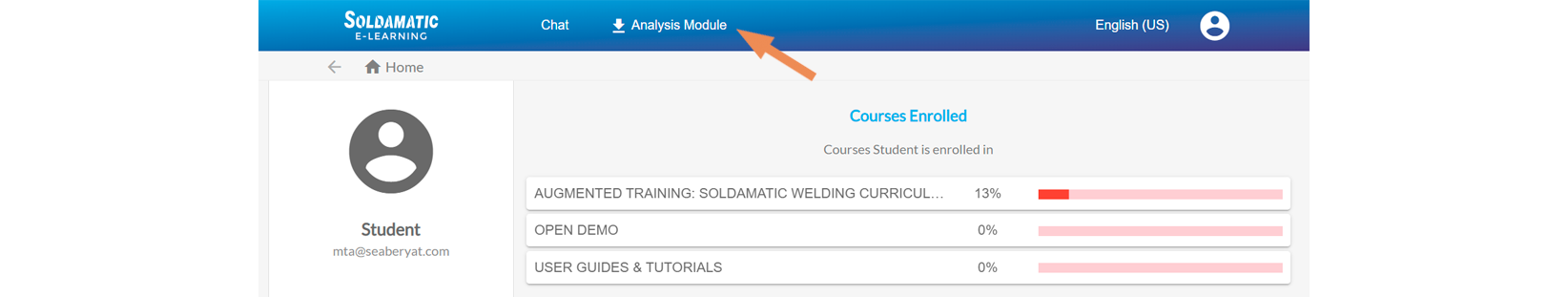 Soldamatic e-Learning is an LMS (Learning Management System) based on Moodle and designed to manage and administer the teaching and learning process of welding from the simulator. This platform provides access to the Soldamatic Database and therefore acts on it. Like any LMS it has two types of access, one for the teacher and one for the student.