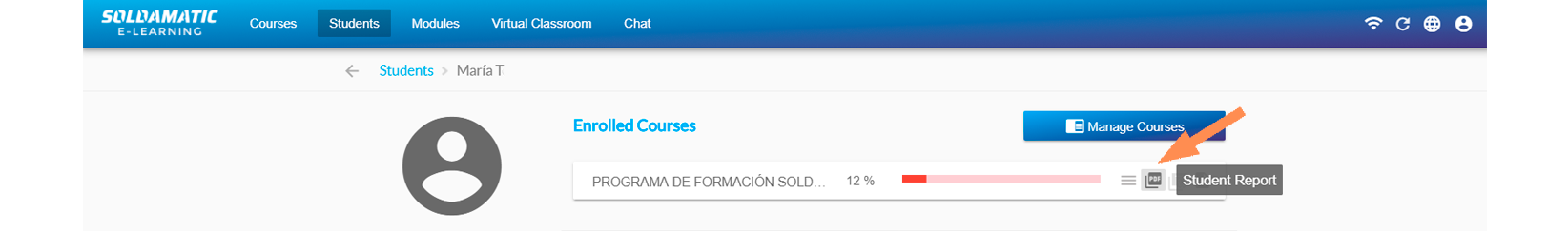 You will get this report by going to the «Courses» section and clicking on the «PDF Report» button.
